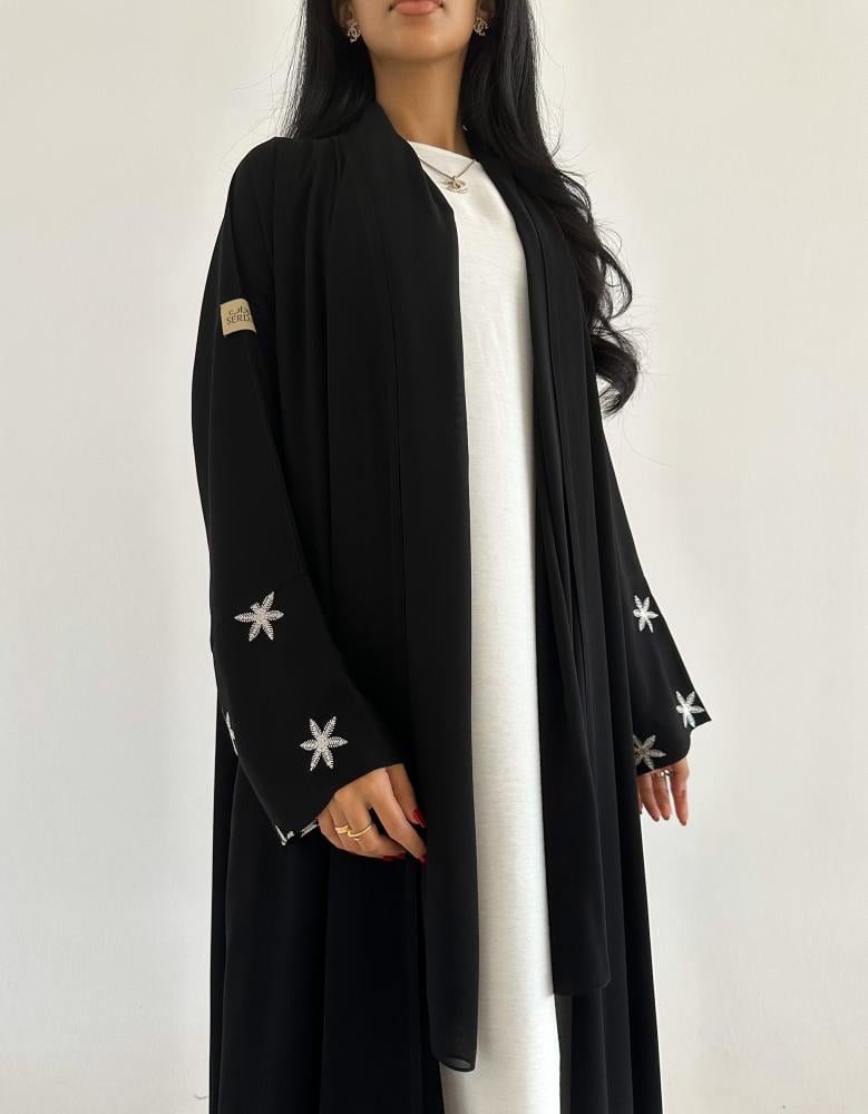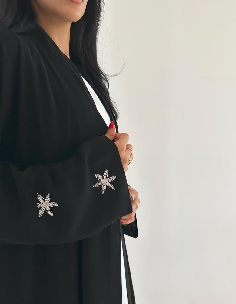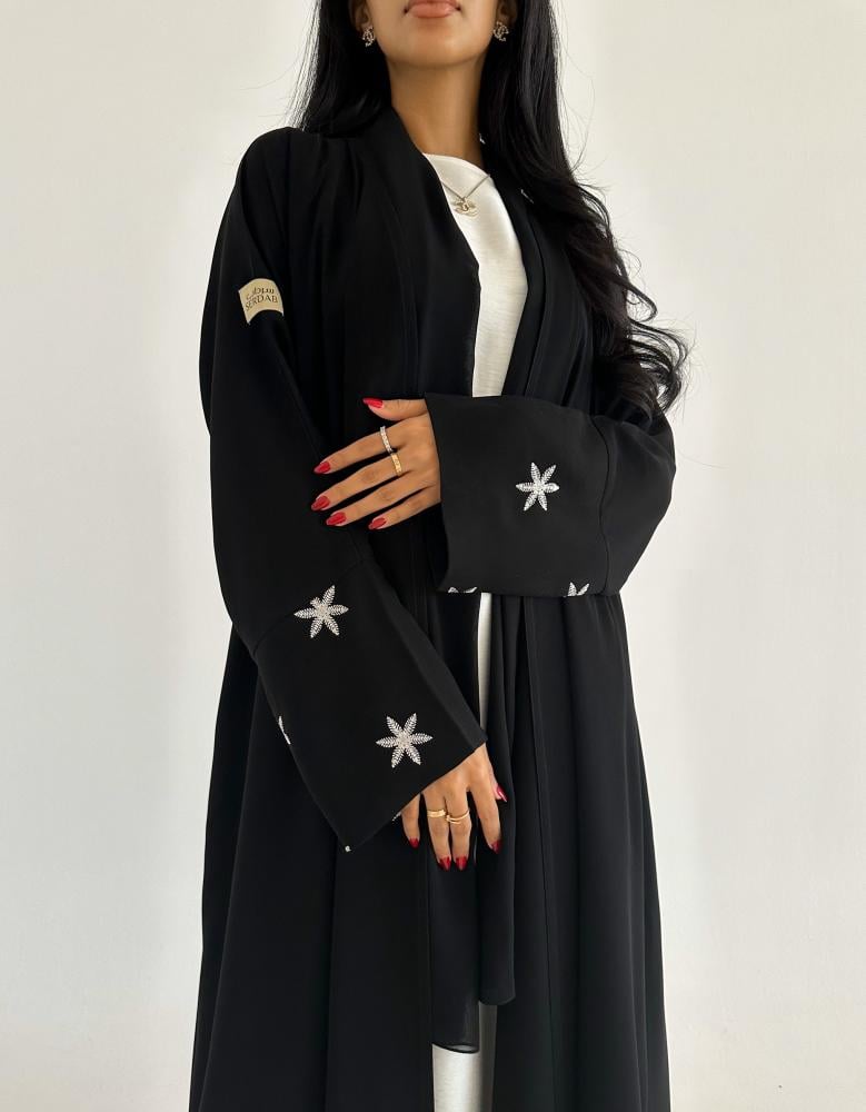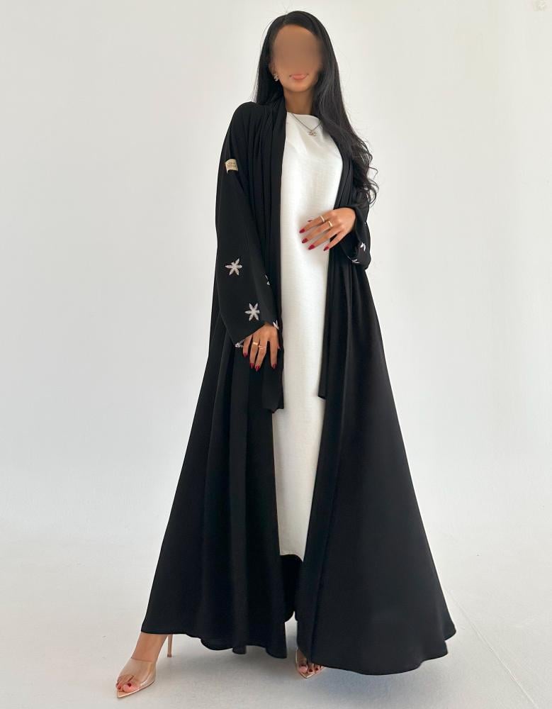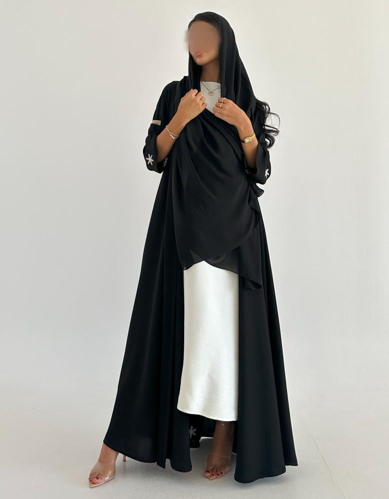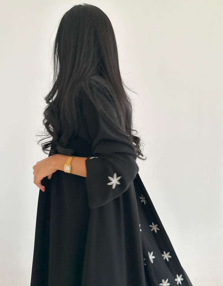 عباية سوداء بأكمام مطرزة وكسرة مطرزة بتصميم كلوش تجسد الأناقة والفخامة بلمسة من التفرد. تجمع هذه العباية بين اللون الأسود الكلاسيكي، الذي يُعَدّ رمزاً للتميز والرقي، والتفاصيل المطرزة التي تضيف لمسة من الفخامة والذوق الرفيع.