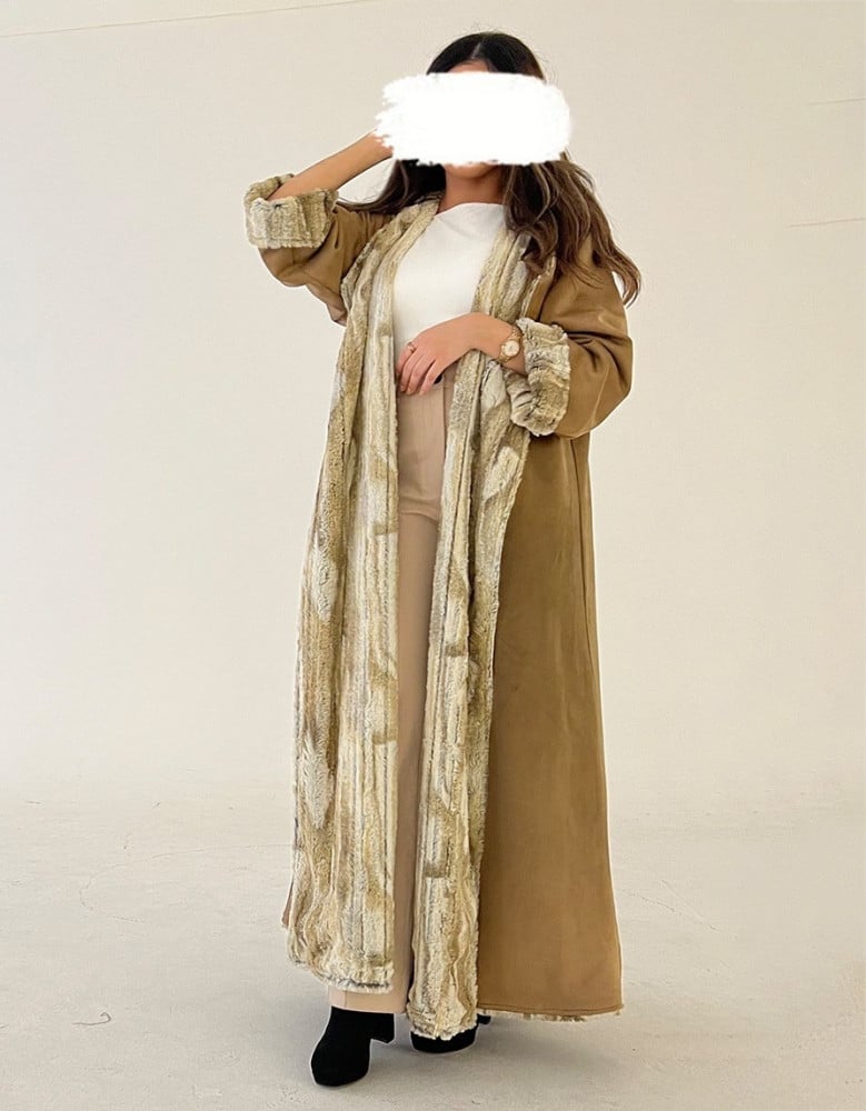 - تجمع العباية بين دفء وأناقة الفراء مع التصميم الكلاسيكي الفاخر .