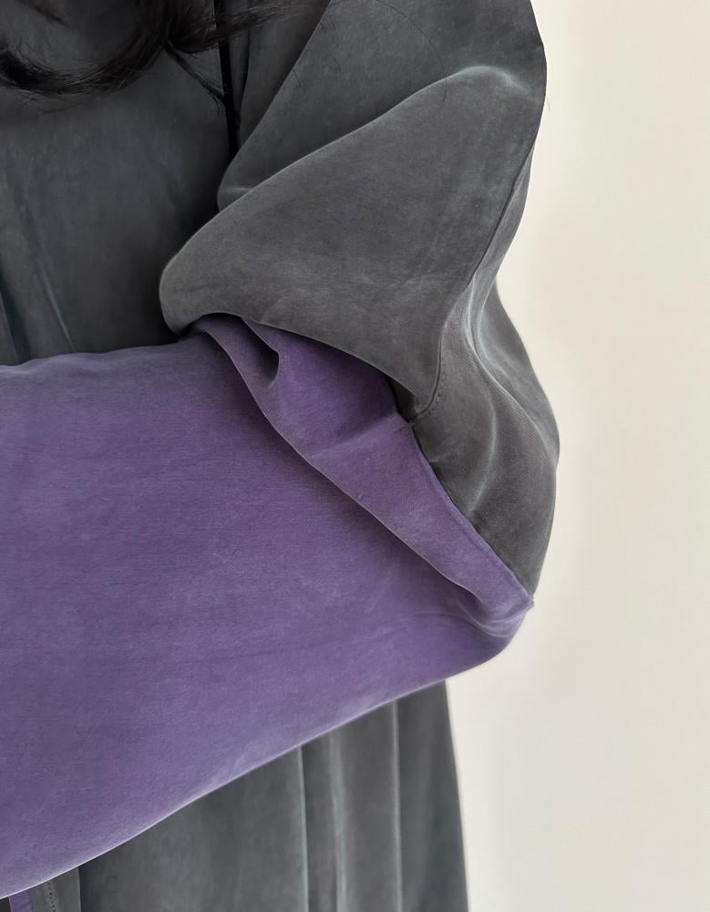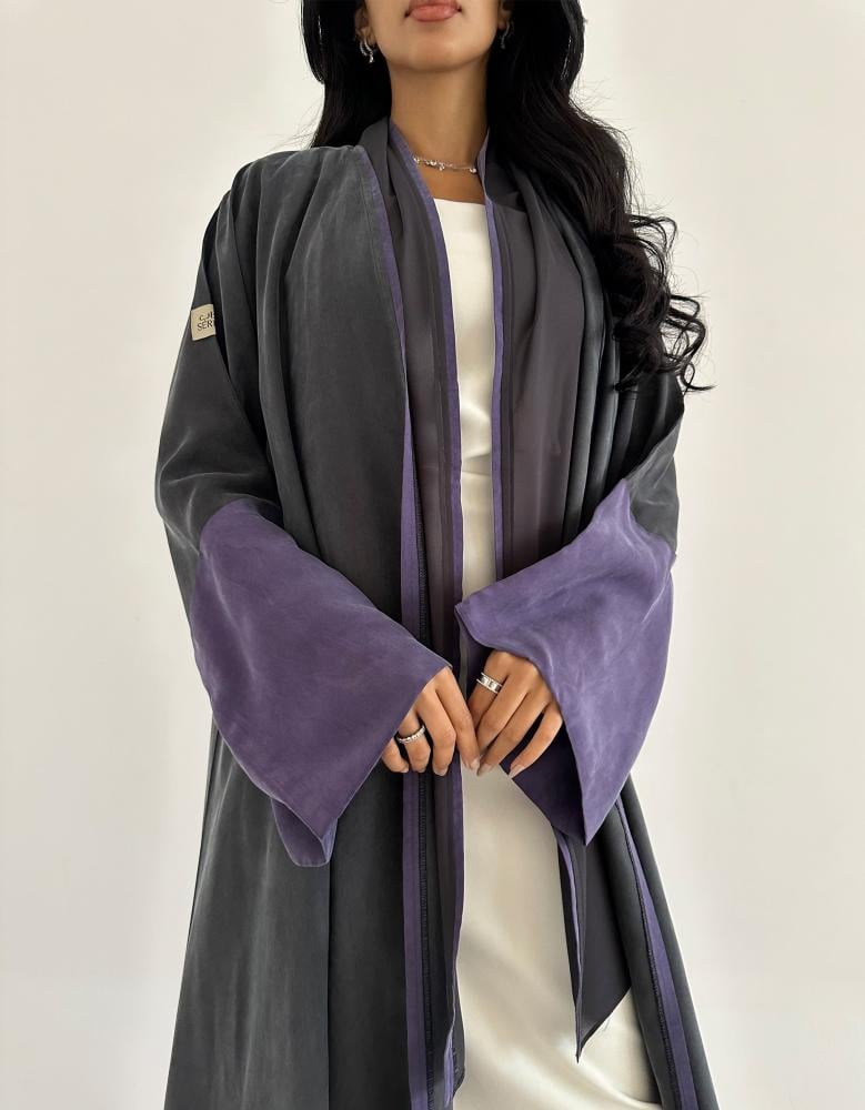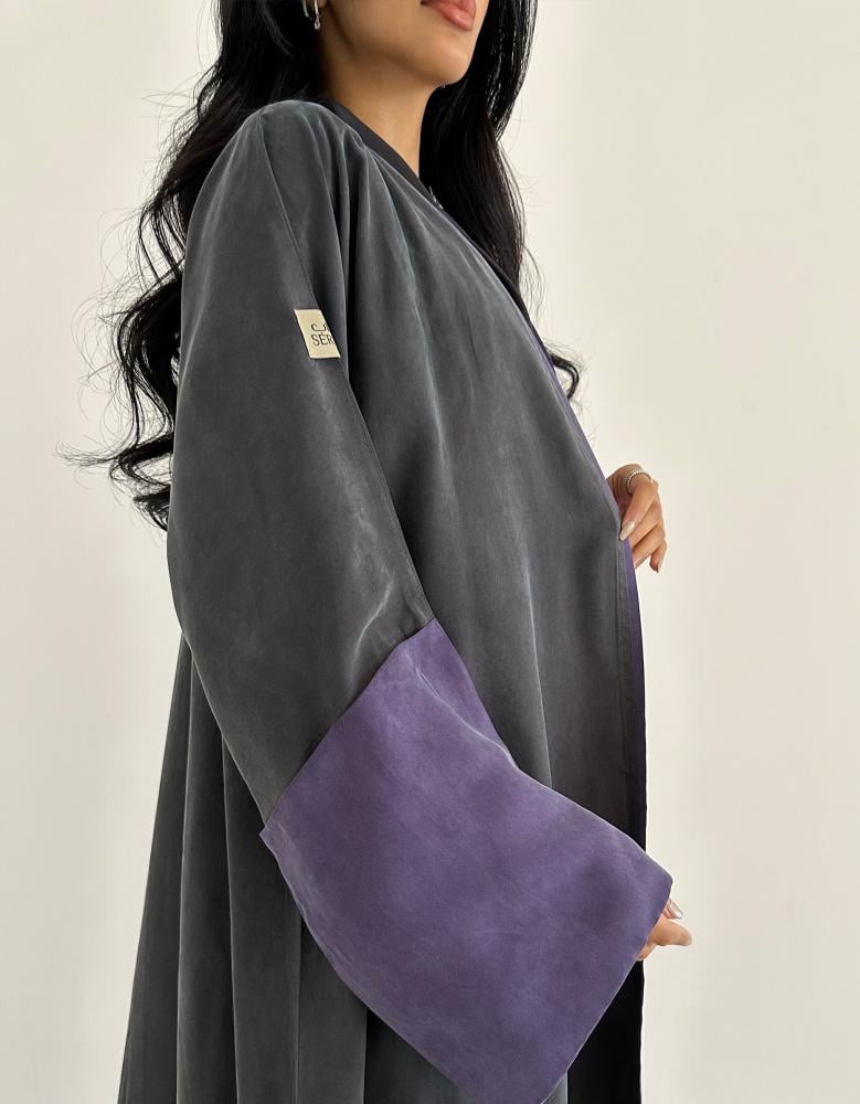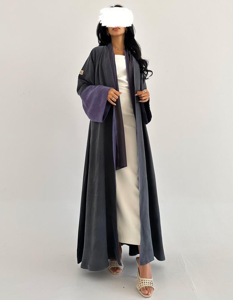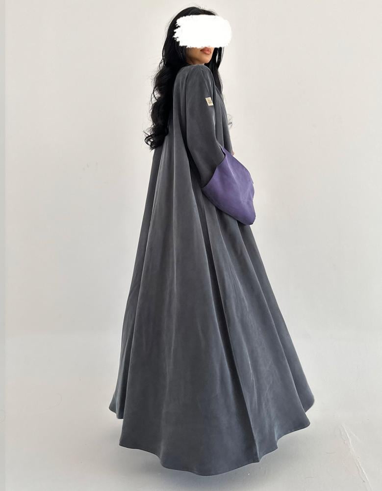 مميزات عباية يومية من الكريب بودرة بنمط الكلوش بلوني الرمادي والموف: