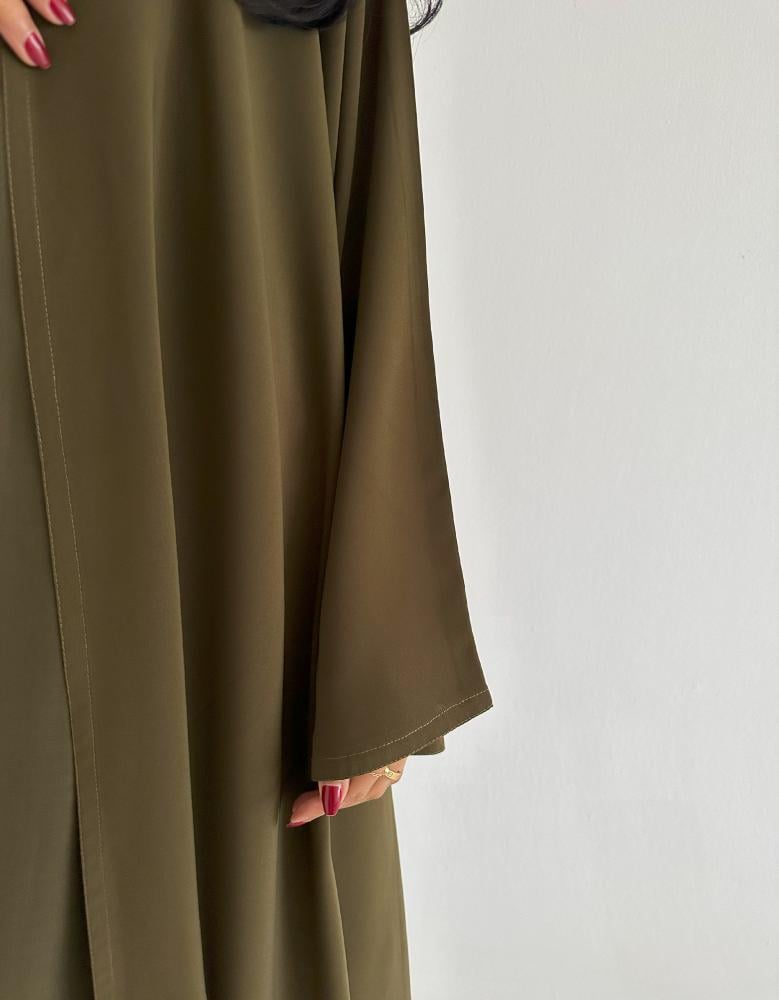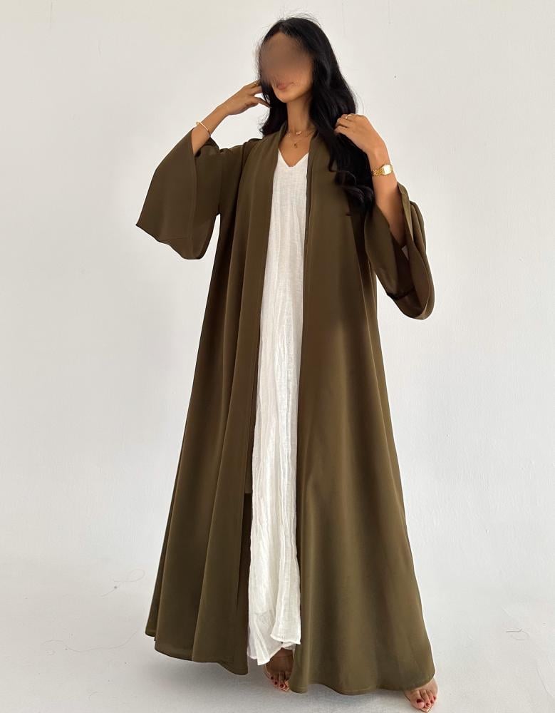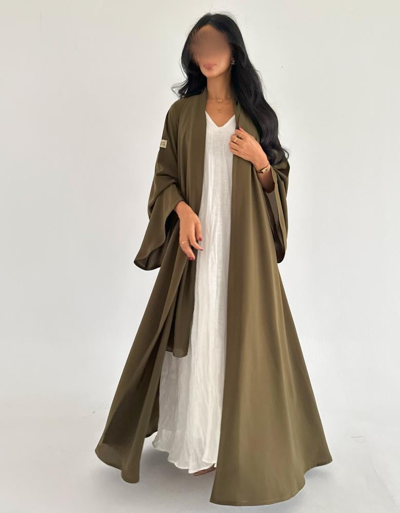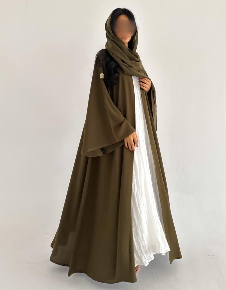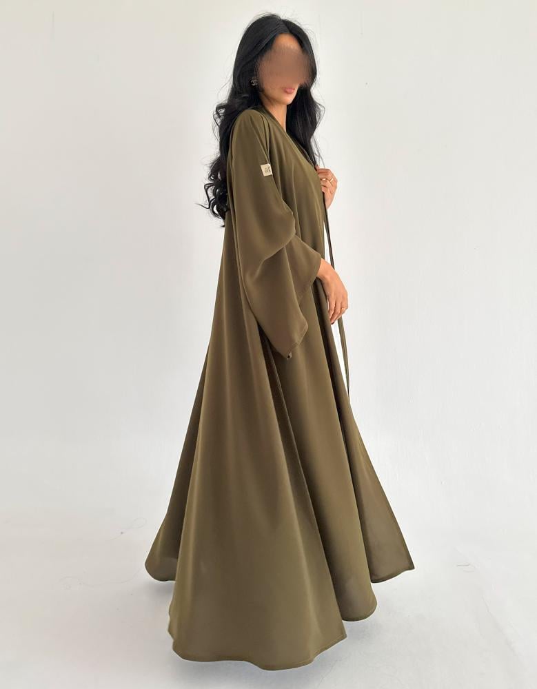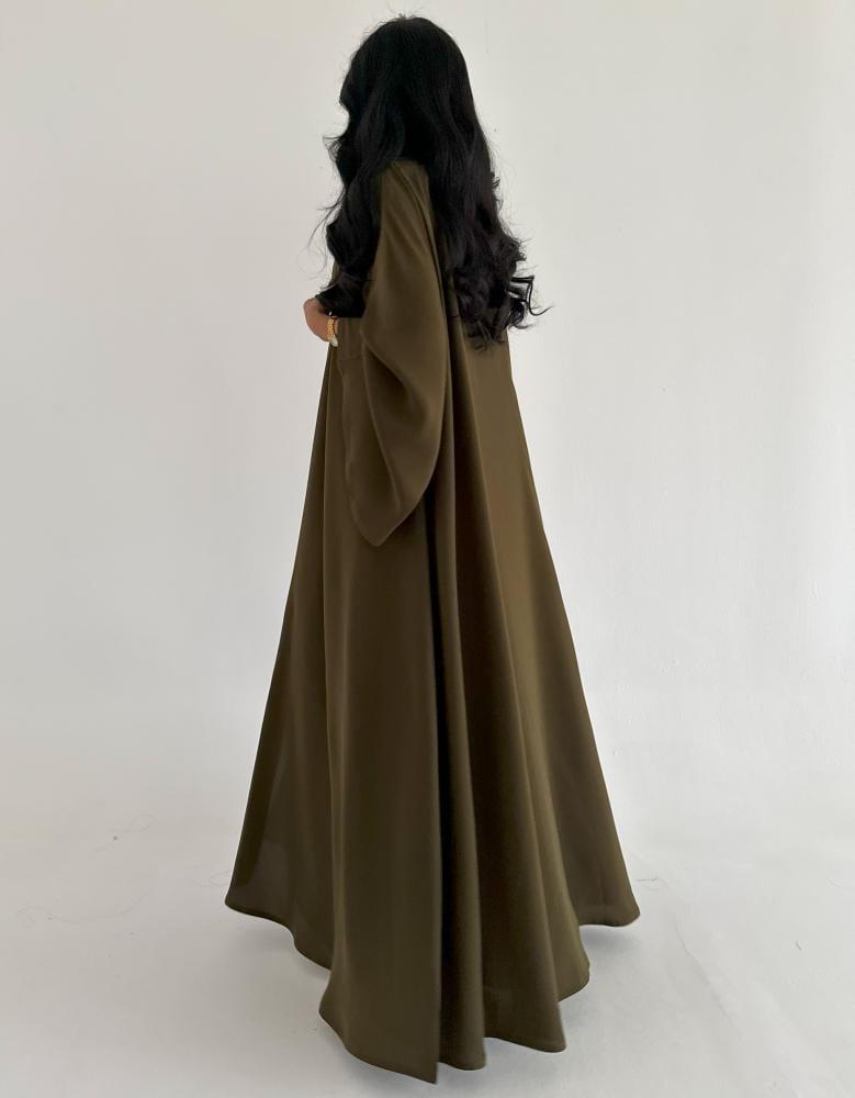 عباية عملية أنيقة مصممة من كريب خفيف يضمن لك الراحة طوال اليوم. أكمام كلوش وقصة كلوش تمنحك حرية الحركة وأناقة مميزة. اللون العشبي يضيف لمسة من الطبيعة والجمال لإطلالتك اليومية