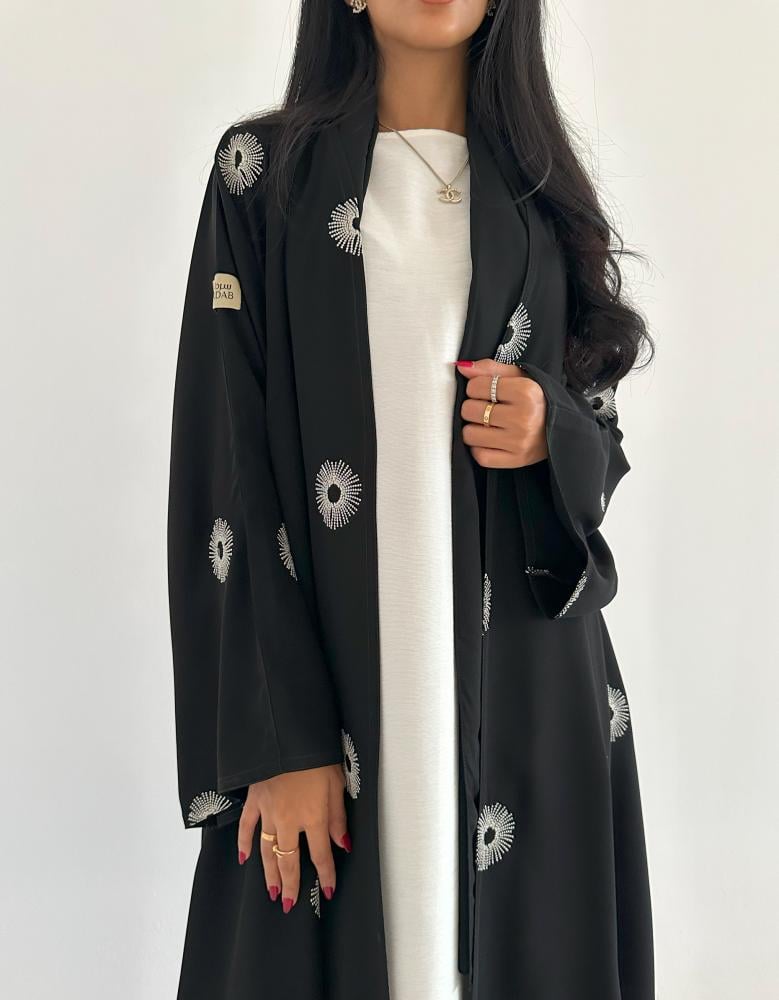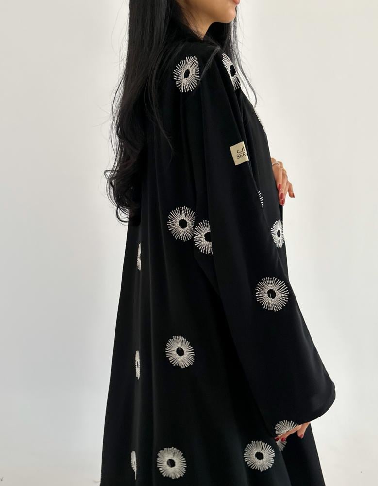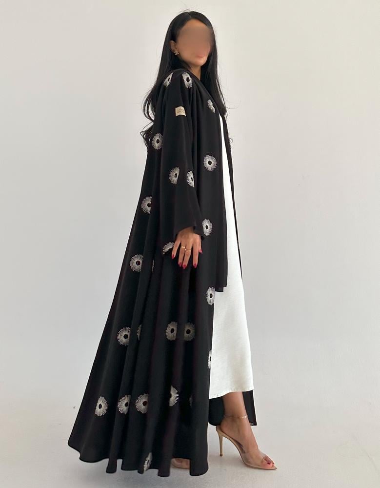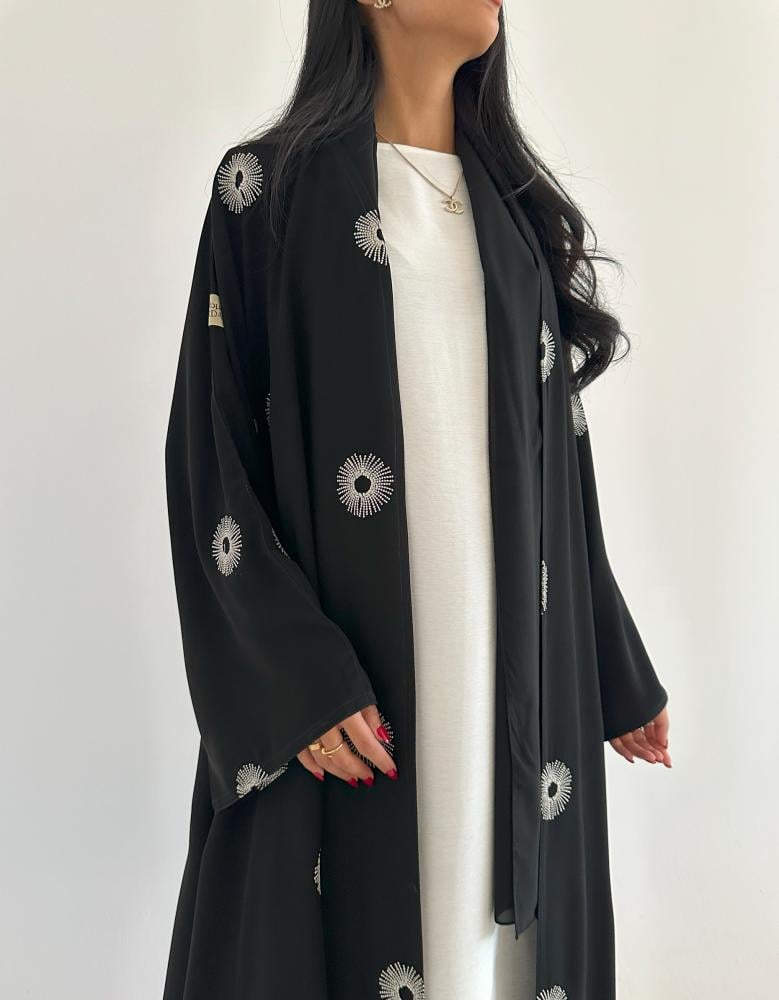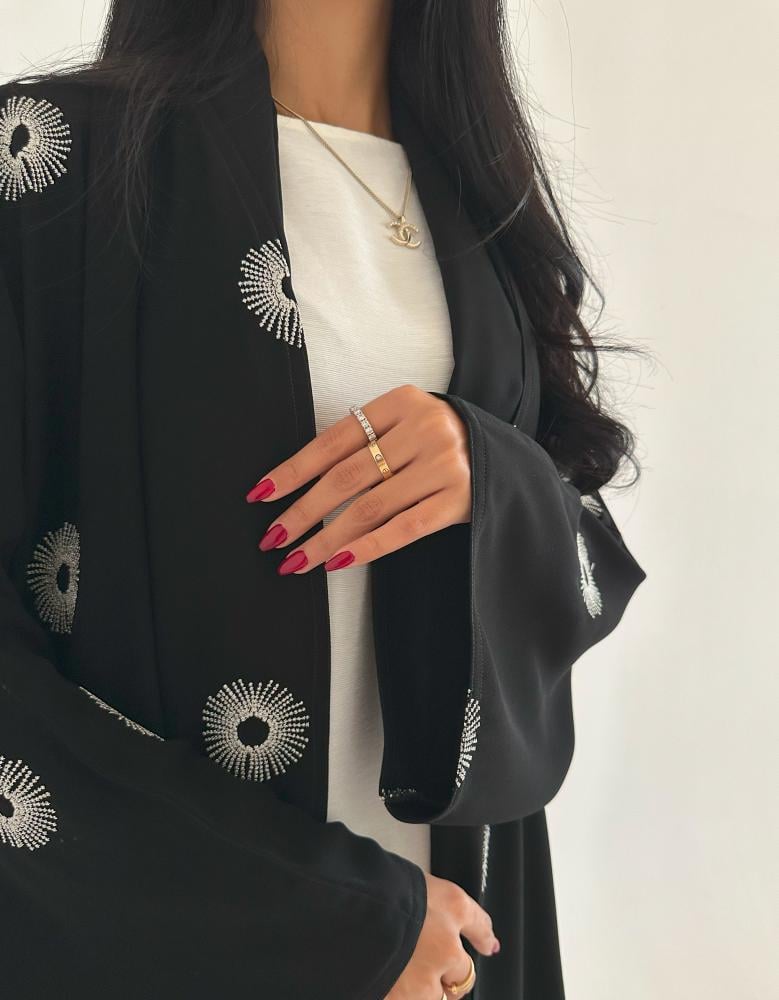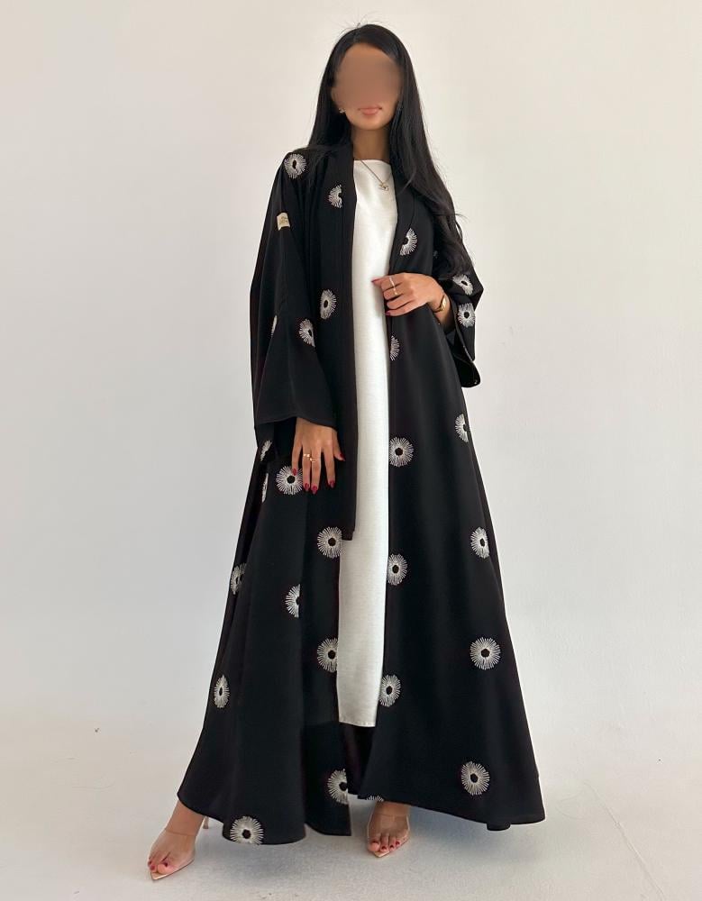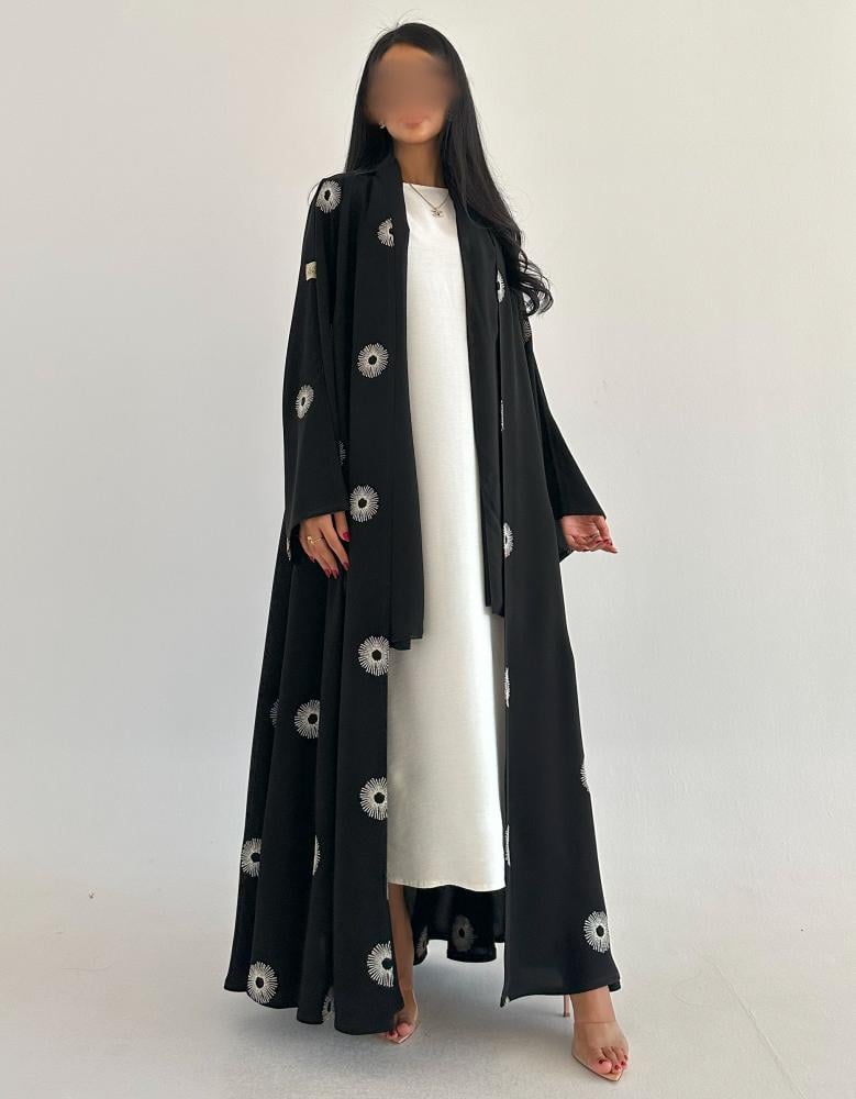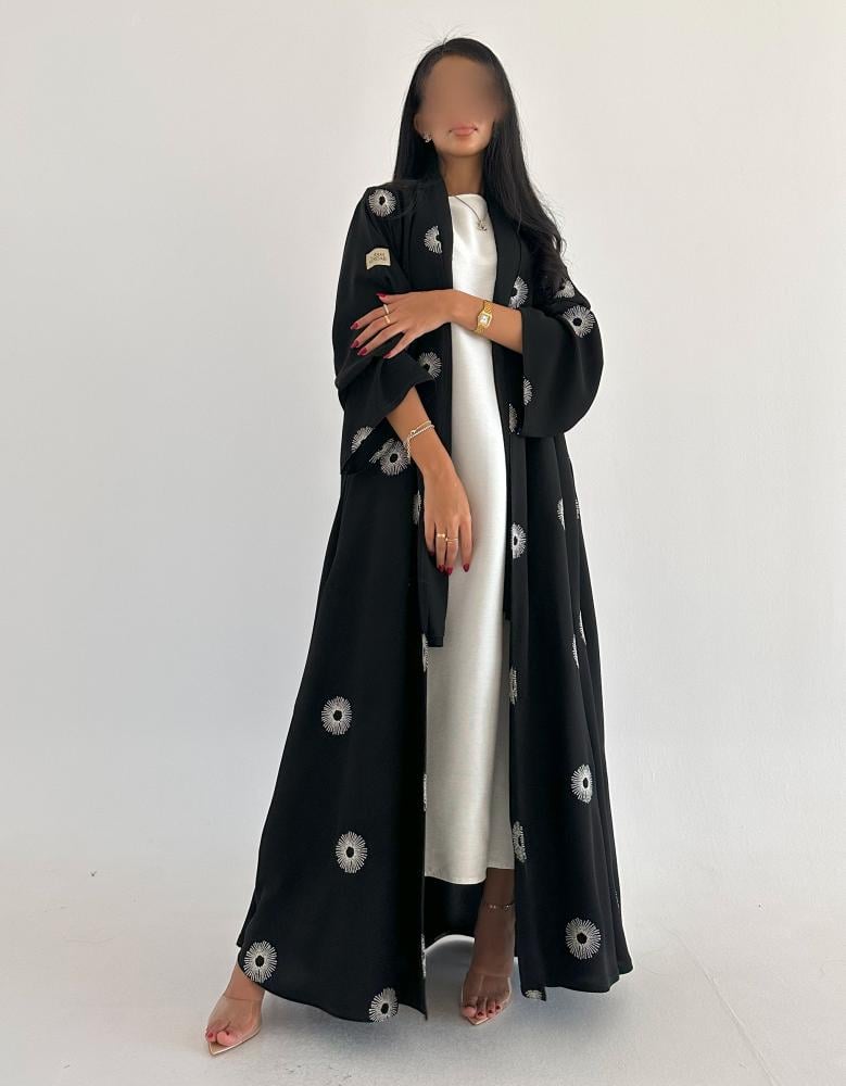تطريزات دقيقة: مزينة بتطريزات متقنة تضيف لمسة من الرقي والفخامة، وتعزز من جمالية العباية.