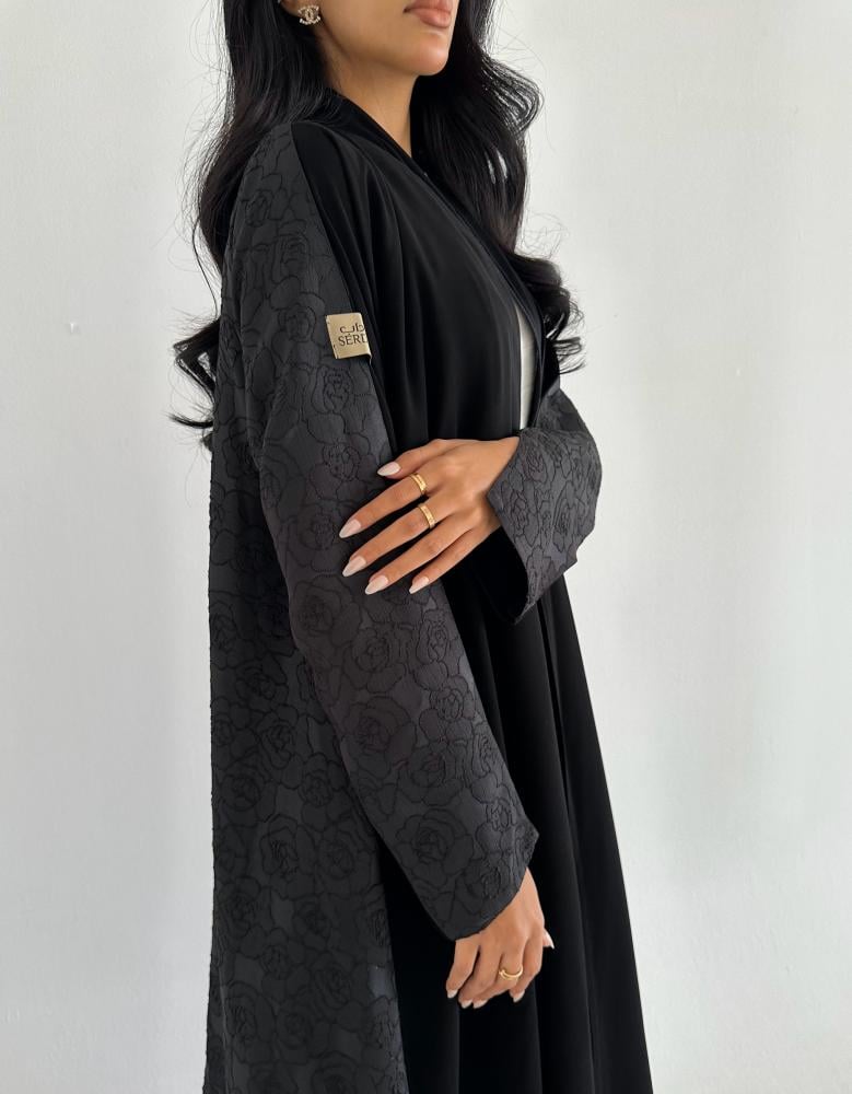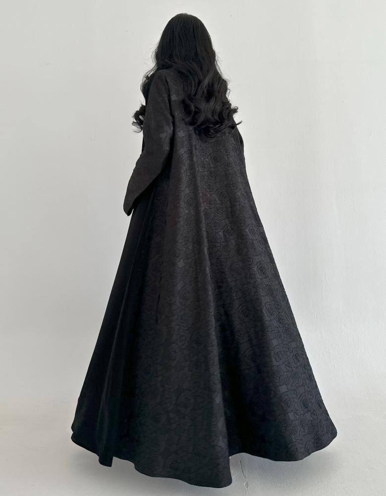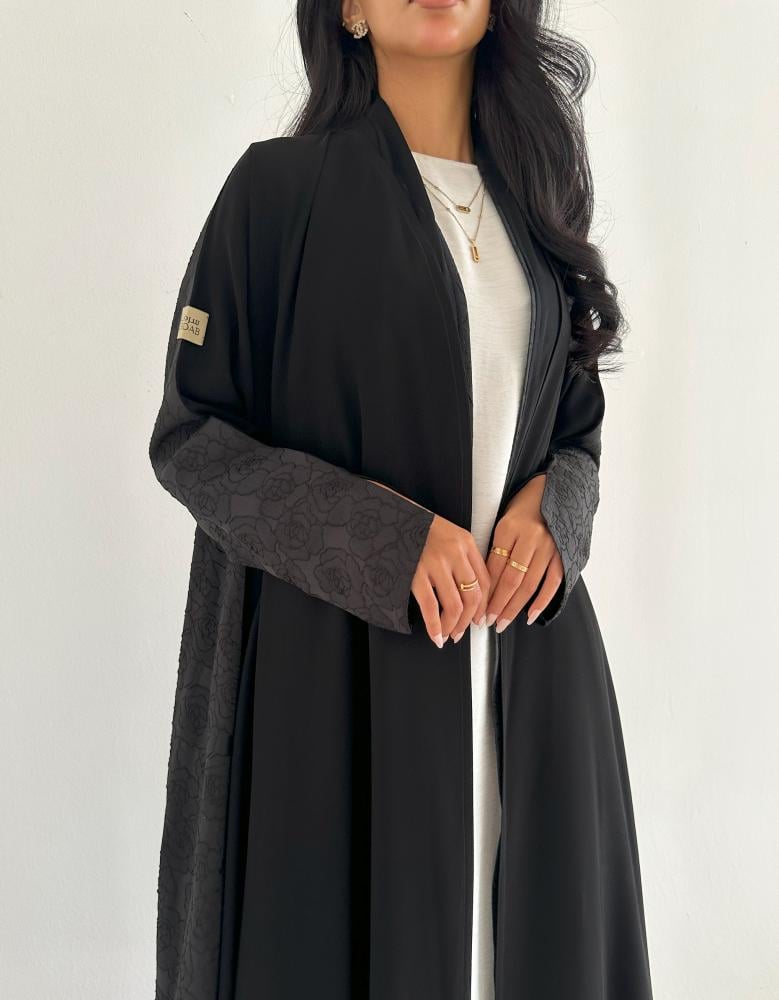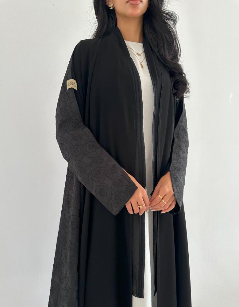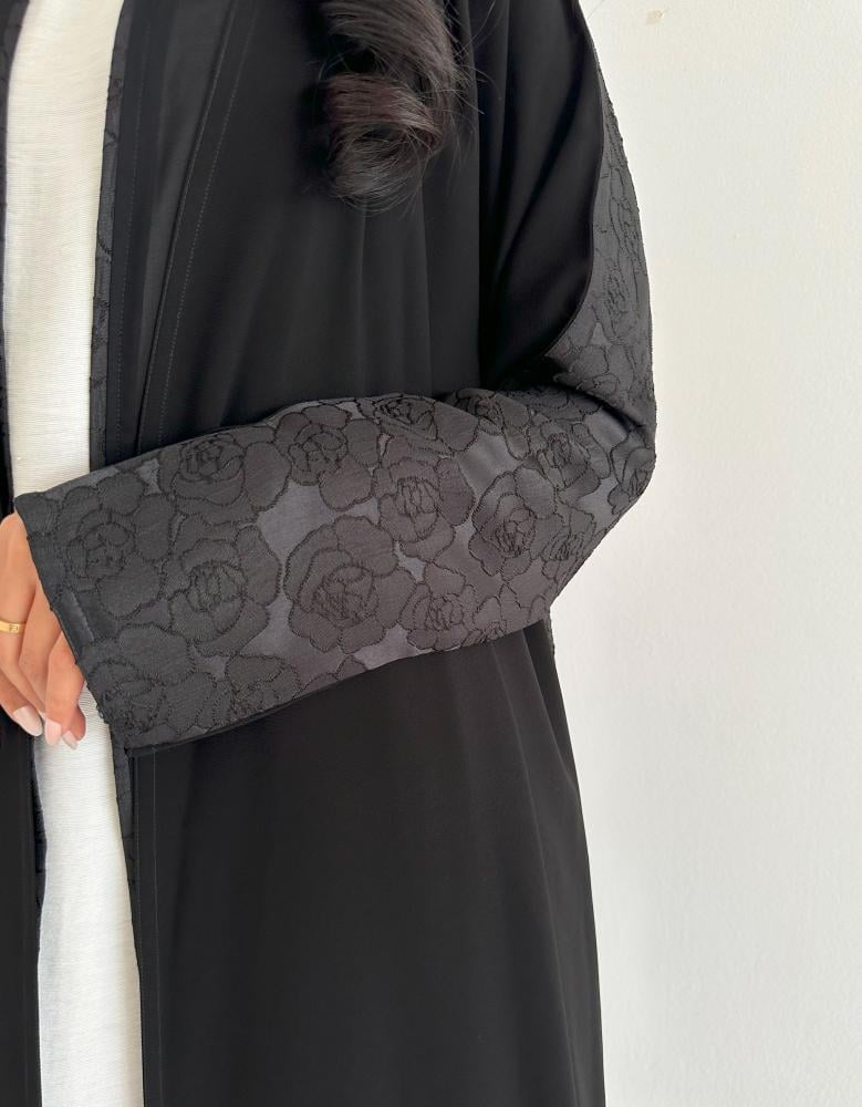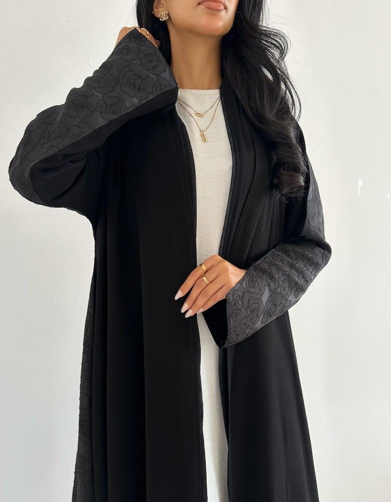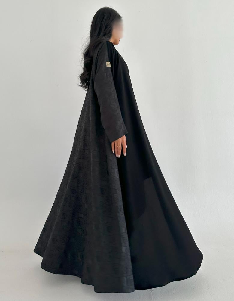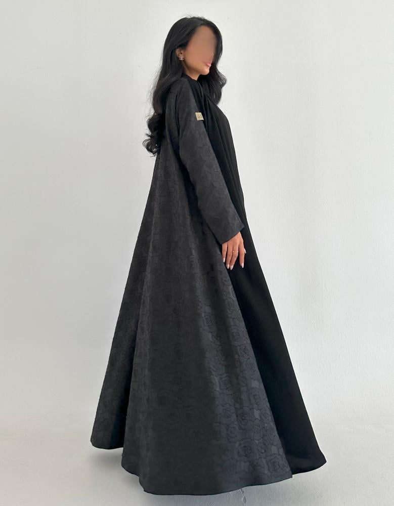 3. تفاصيل ورود من الخلف: تطريزات الورود تضفي لمسة أنثوية رقيقة وفنية، مما يمنح العباية مظهراً مميزاً ويبرز الجمال الطبيعي.