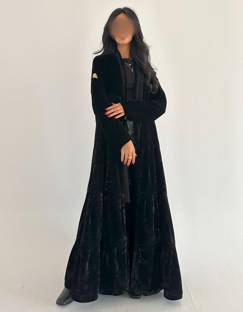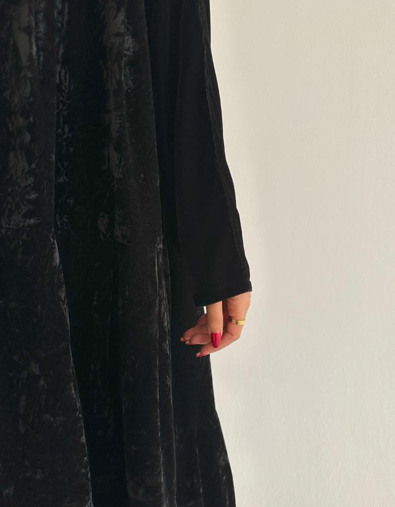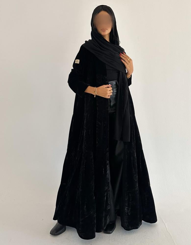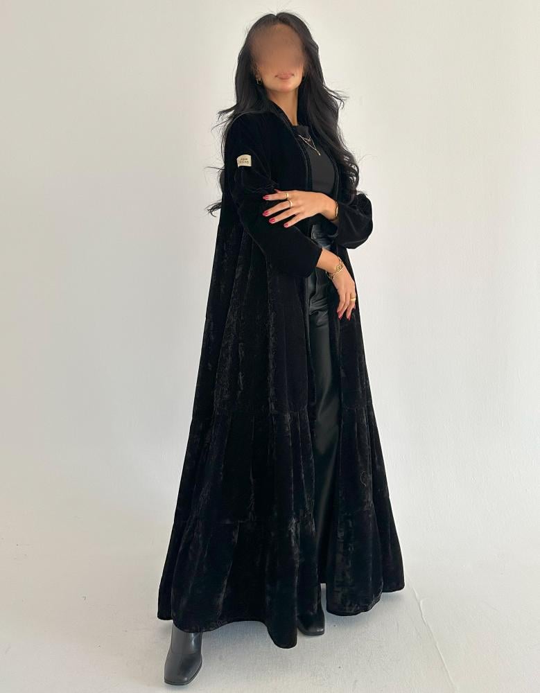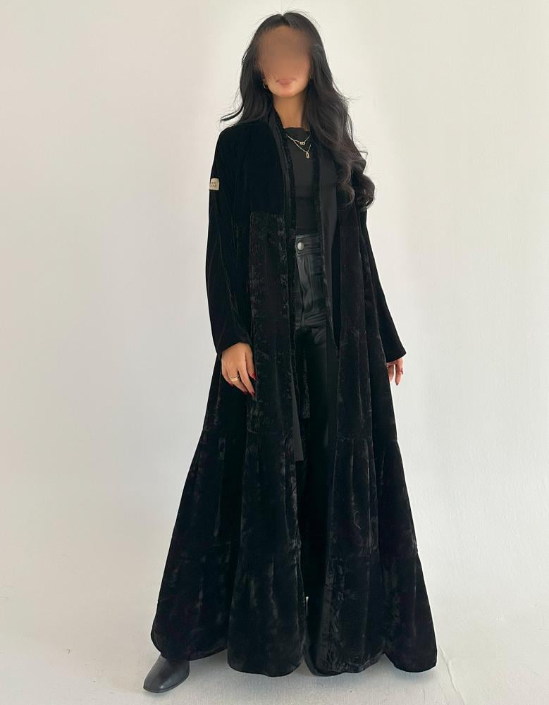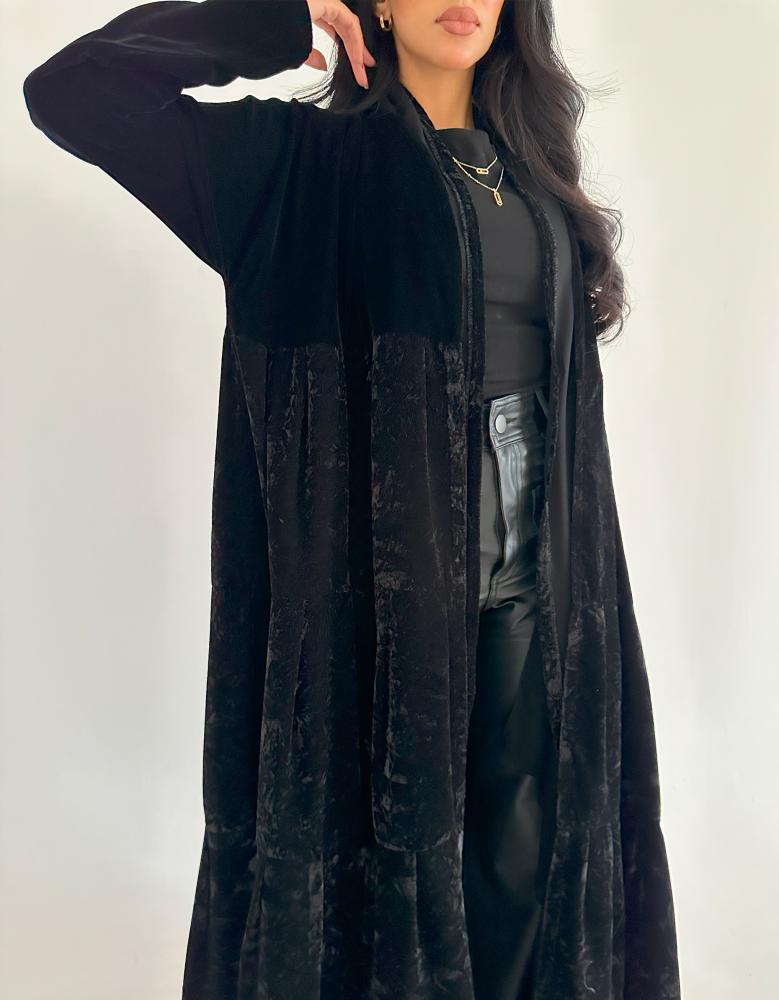 مصنوعة من قماش المخمل الأسود الذي يضفي على العباية لمسة من الفخامة ويعكس الإحساس بالراحة والدفء.