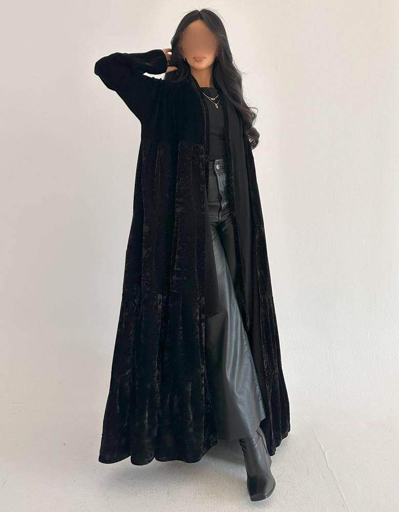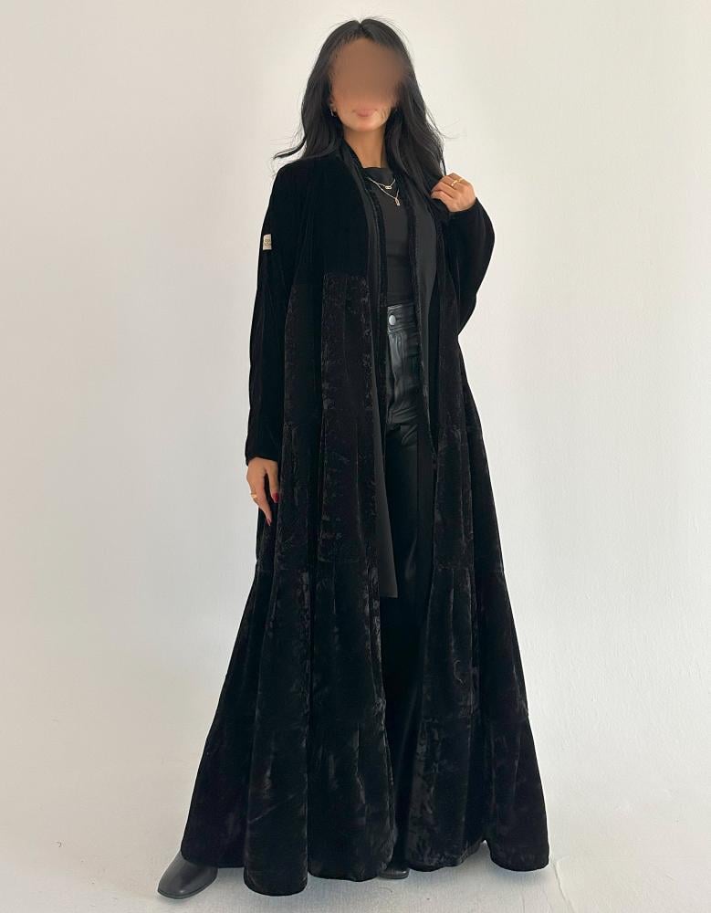 تعد عباية المخمل الأسود بأسود كلوش طبقات واحدة من القطع الراقية التي تجمع بين الأناقة الكلاسيكية والتصميم العصري.