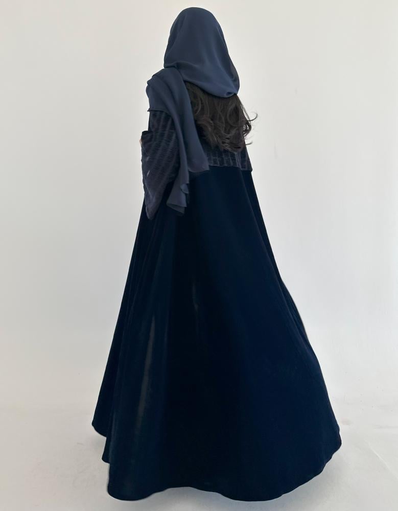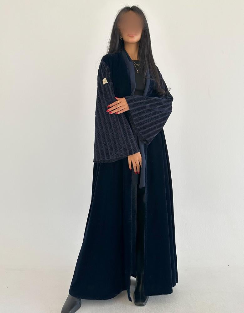تعد عباية مخمل كحلي مع شيفون مخطط نص كلوش رمزًا للأناقة والرقي بلمسة عصرية فريدة. تجمع هذه العباية بين فخامة المخمل الناعم وتصميم الشيفون المخطط الذي يضيف تفاصيل جذابة وانسيابية مثالية.
