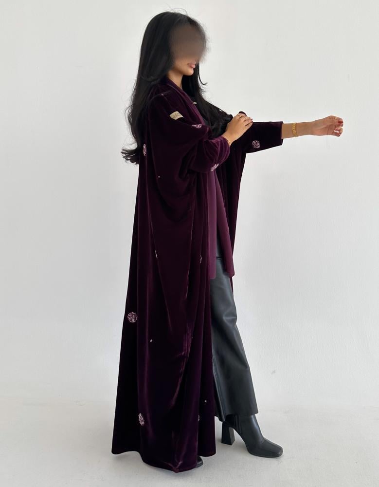 مواصفات العباية : مخمل مطرز يدوي ربع بشت