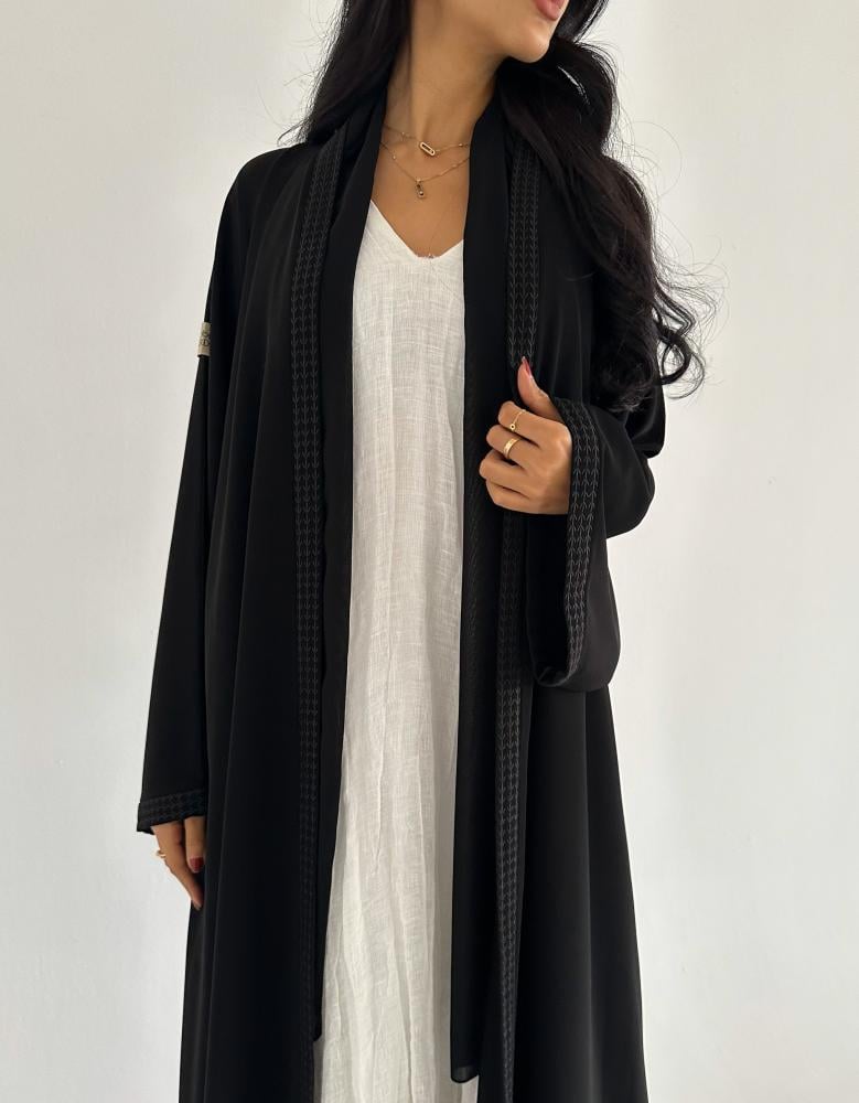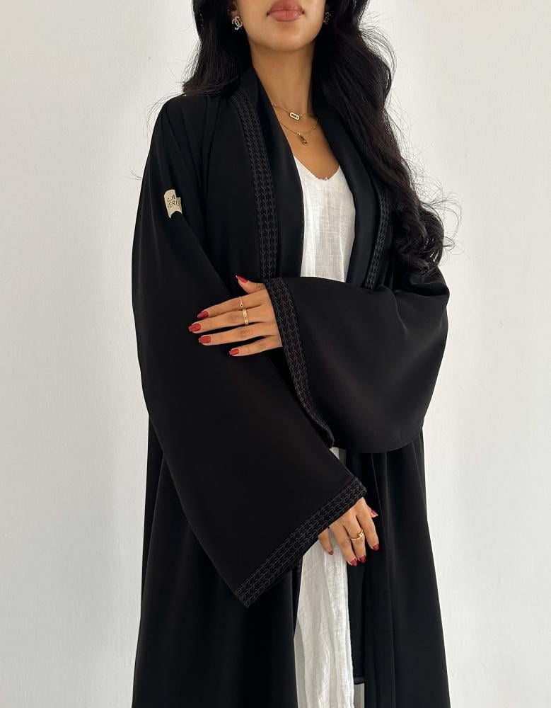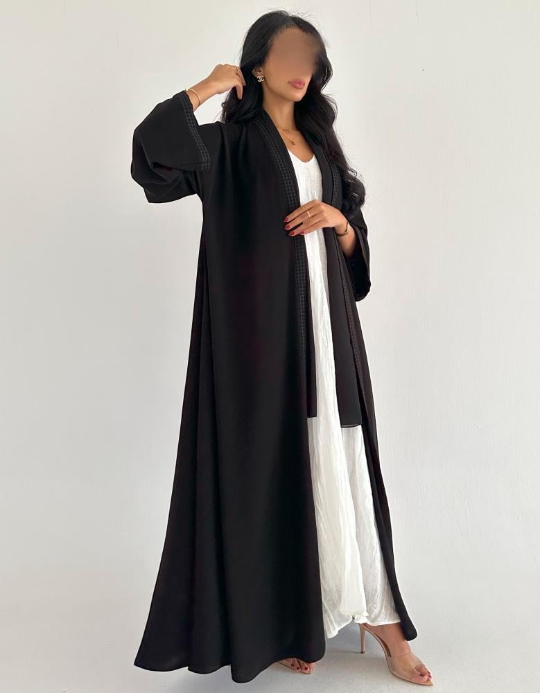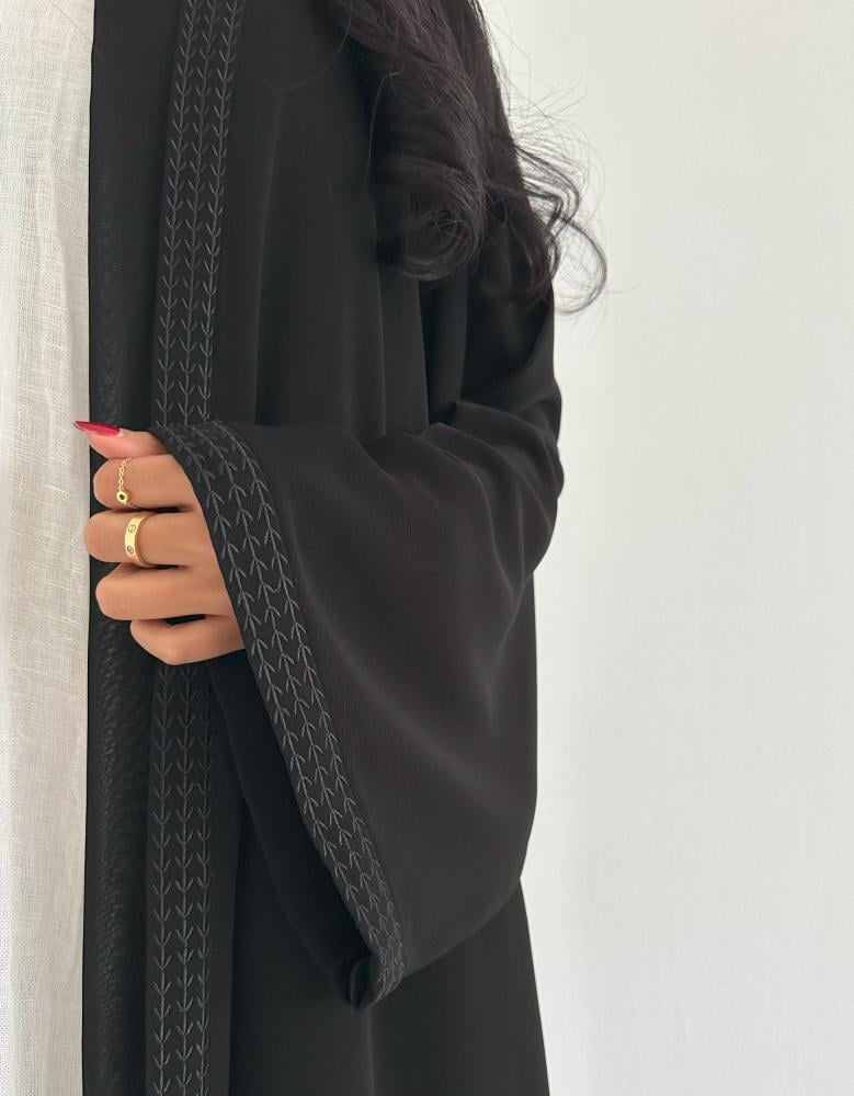 عباية عملية أنيقة بلمسة فاخرة، مصنوعة من كريب ملكي عالي الجودة ومطرزة بتطريز أسود ناعم يضفي لمسة راقية. تصميم كلوش واسع وأكمام مريحة تجعلها خيارًا مثاليًا لإطلالتك اليومية